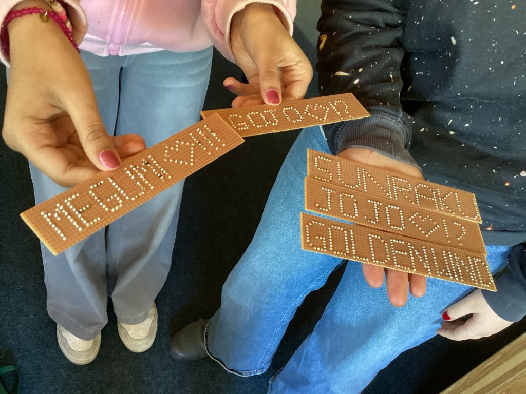 Beim Programmieren mit dem „Calliope mini“ konnten nach kürzester Zeit erste Reaktionen des Einplatinencomputers hervorgerufen werden: Vom Aufleuchten einer LED über das Anzeigen von Text bis hin zu einer Steuerung für eine Straßenlampe mittels Lichtsensor oder das Abspielen einer Melodie als Fehlersignal beim „heißen Draht“ waren einige Erfolgserlebnisse zu beobachten. Auch das Löten begeisterte die Teilnehmerinnen, die schon nach kurzer Übungszeit tolle Resultate in Form von kreativ gestalteten Schildern hervorbrachten.